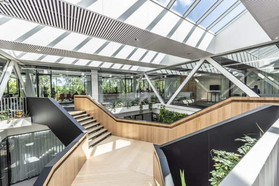 Well-being van de medewerkers en een duurzaam gebouw waren de belangrijkste pijlers voor BESIX. Een vrij indeelbaar vloerveld met een ontwerp met grote glazen gevels en vakwerkspanten vormden hiervoor de basis. In het hart van het gebouw worden de ruimtes verbonden door een atrium met een brede trap en veel groen.