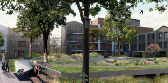 De bewoners delen een grote binnentuin van 1700 m2. Hier bevinden zich een collectieve kas, een vijver en speelmogelijkheden voor kinderen.